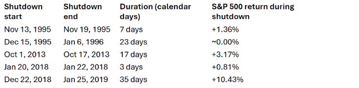 As for the 800-pound gorilla in the room, Congress was unable to agree on a budget, sending the government into a shutdown effective last Wednesday, October 1. The political game is quite annoying to me, as the government seems to not consider my opinion before making decisions, but I digress. I was quite surprised that the markets went up, and Cornerstone Portfolio Research (CPR) provided this table reflecting market performance during each of the previous five shutdown over the last 30 years. As noted by the table, the markets have generally performed well during shutdowns, but let’s not cheer so quickly. The concern is that if the shutdown lasts more than 30 days, many government workers will have missed two consecutive pay checks, which could be problematic for those folks who live paycheck to paycheck. See the table below.